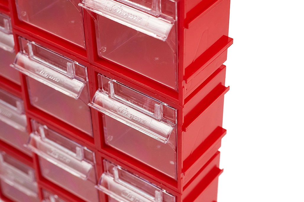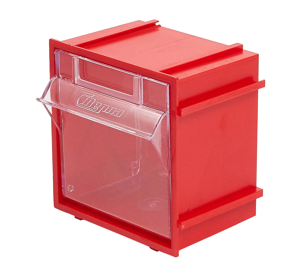 Короб откидной Стелла-техник Single-101 красный, прозрачный предназначен для хранения мелкоштучных изделий. Данная система хранения не подвержена случайному опрокидыванию. Полезный внутренний размер ячейки 50х43х47мм. Пластиковый короб имеет специальные пазы, благодаря которым можно соединять между собой несколько коробов, наращивать в ширину и высоту до нужных размеров, образуя модульную систему. На задней стенке присутствуют отверстия, что позволяют навешивать их на стену. Преимущества: Обзорность содержимого сквозь прозрачные внутренние ячейки. Стандартный цвет наружной кассеты откидного короба-красный, внутренней – прозрачный. На внутреннем коробе есть специальный отсек для информационных съемных бирок. Легкое и быстрое извлечение внутреннего короба для опустошения или наполнения. Температура эксплуатации от -10 до +70С.