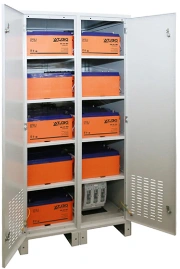 В дверях, на задней и верхней панели и имеются вентиляционные отверстия для обеспечения циркуляции вoздуxa. Во избежание несанкционированного доступа дверцы запираются на ключ. Кабинеты комплектуются высококачественными батареями DELTA, изготовленными по технологии AGM (Absorbent Glass Mat — электролит, абсорбированный в стекловолоконном сепараторе).